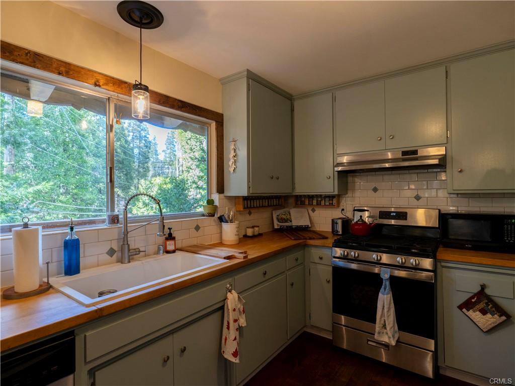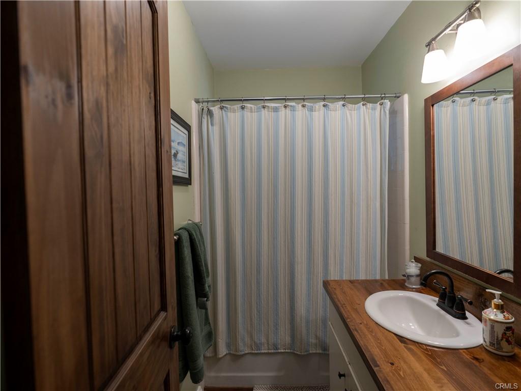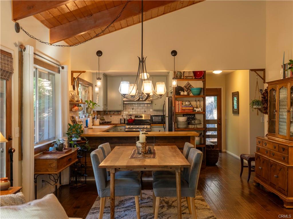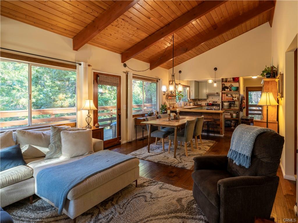 As you walk in the home, there's a hallway area for you to drop off your shoes, hats and coats. At the end of the hallway the home opens up to the living area and the kitchen. The kitchen is fully equipped and has a breakfast bar that opens up to the living room. Between the kitchen and the living room is a dining area. Open beamed ceiling too! The living room has a slate faced fireplace with a wood stove insert to add extra warmth in the chilly winter days. On the front of the home just off the dining room and living room is a large wraparound deck. Another great place to enjoy the mountain air!